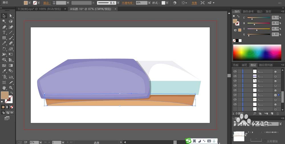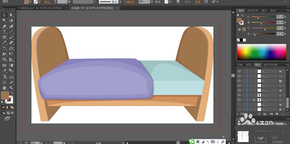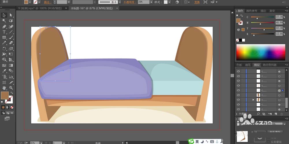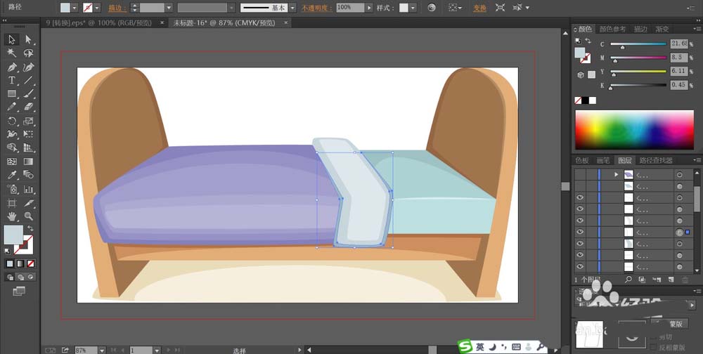 4、这一步,我们用灰棕色填充床的下方的木架,再分别做出暗光效果与高光效果。继续用天蓝色填充床右侧的被单路径。在边缘做出高光效果,在上方做出暗光效果。