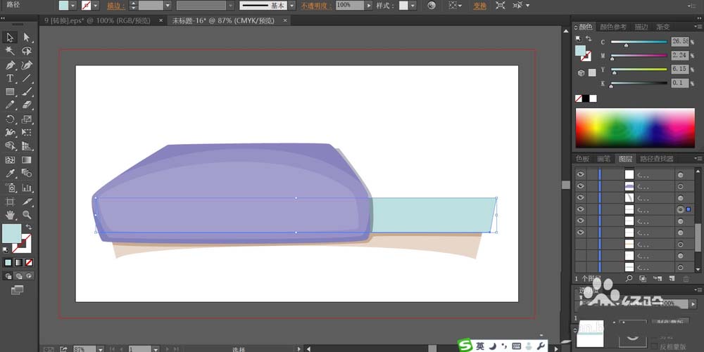 6、这一步,我们用天蓝色填充小床上面的被子的右侧部分,我们用不同的色彩模式做出三层光线效果,通过色彩模式与透明度的变化来呈现。