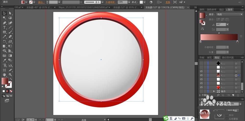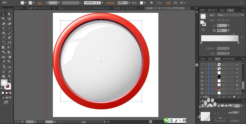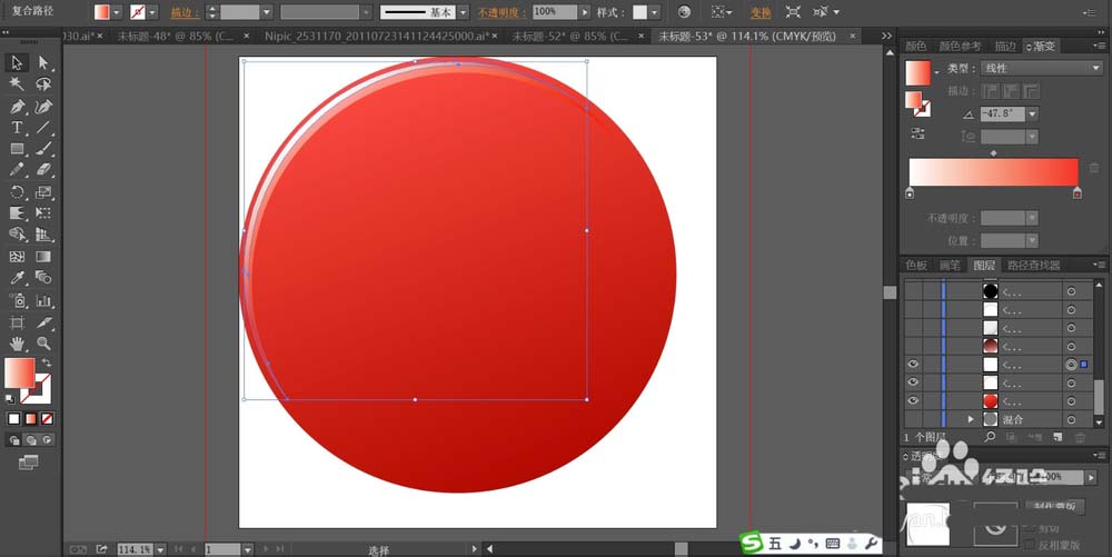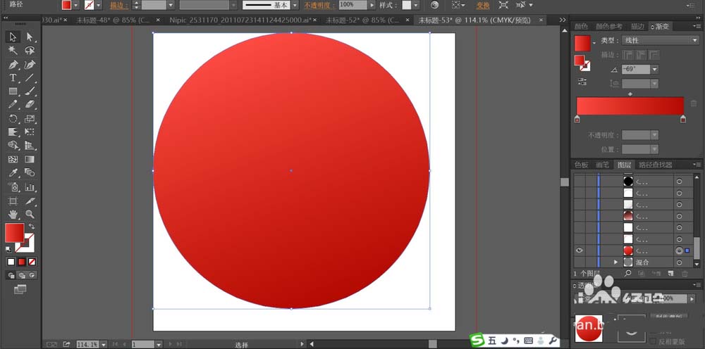 2、使用红色的渐变填充整个圆形的墙钟的圆形轮廓,让左侧稍亮右侧稍暗。