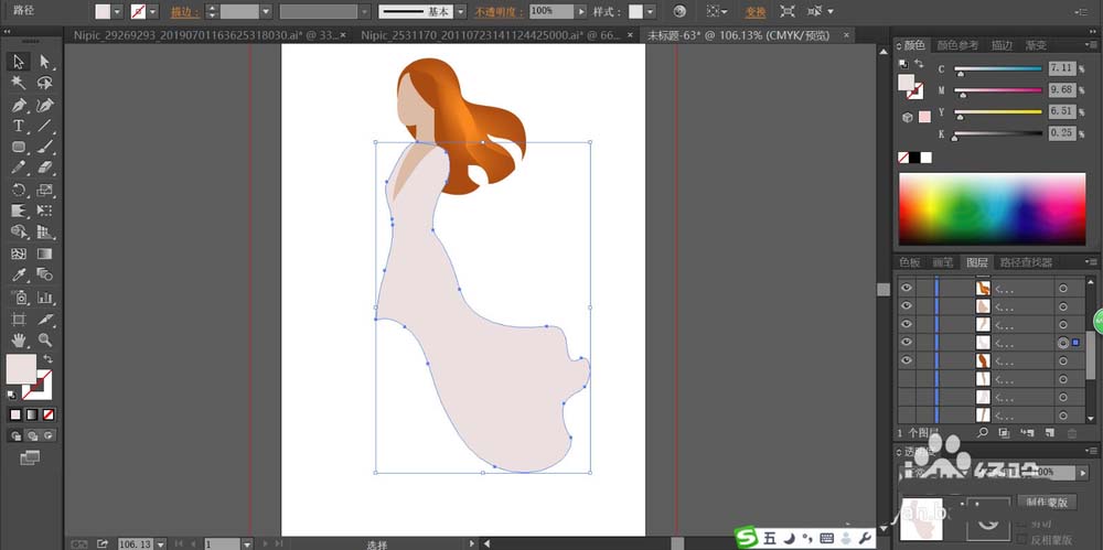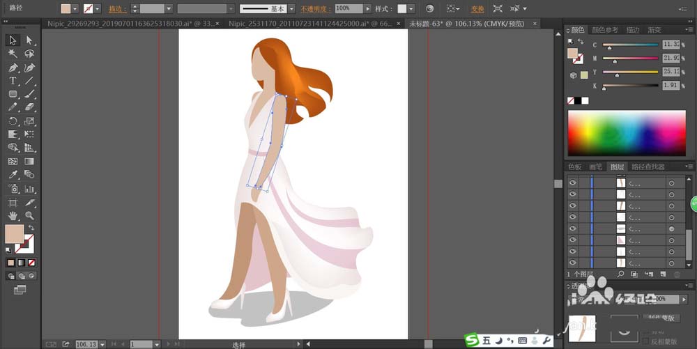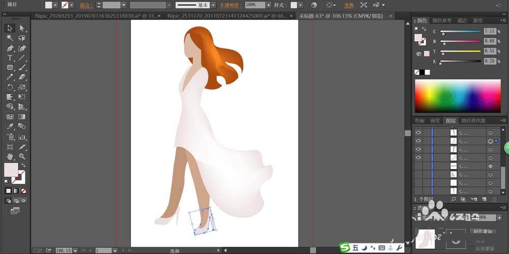 5、用淡桃色填充女孩的高跟鞋的路径,再用桃红色填充长裙在左侧的暗光区域。