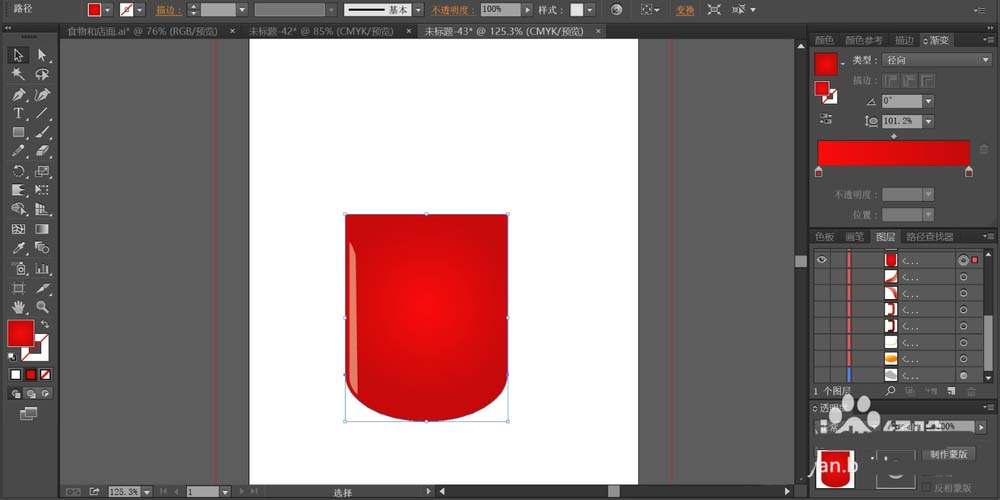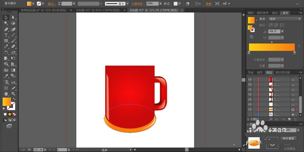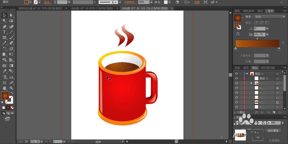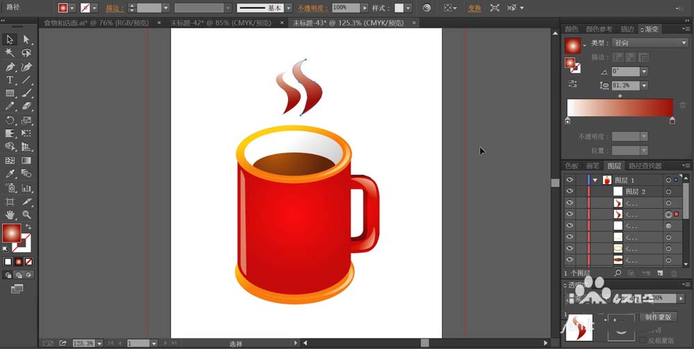 2、先用红色的渐变填充咖啡杯的正面路径,使用径向渐变填充。