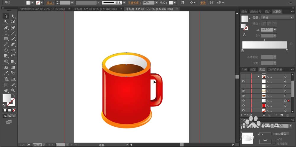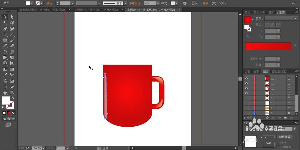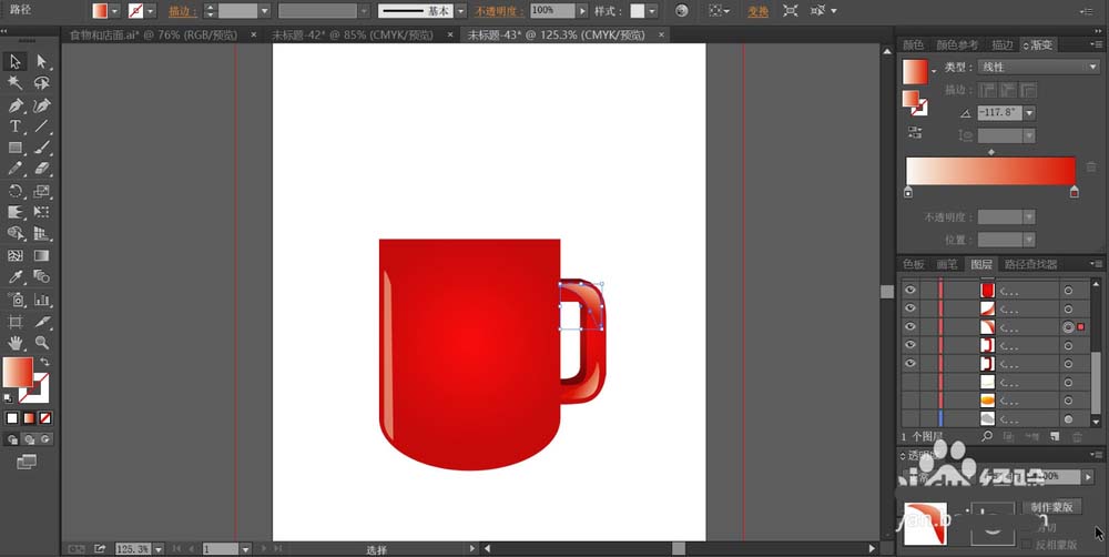 3、用透明度为30%的白色填充咖啡杯正面左侧的高光路径,再用明暗两种不同的红色的渐变填充咖啡杯右侧的手柄。