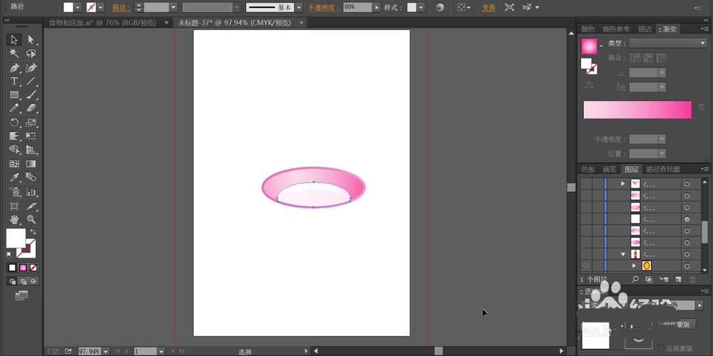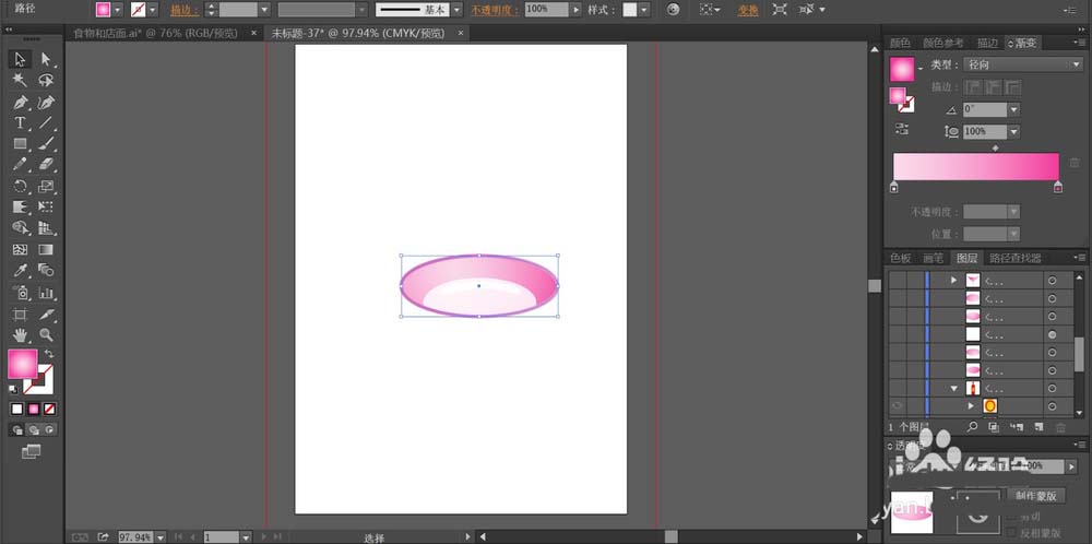 3、接着,我们使用圆形画出玻璃杯的圆形的底盘,我们用粉红色的径向渐变填充上面路径,用线性的粉红色的渐变填充底盘下方的正面路径。