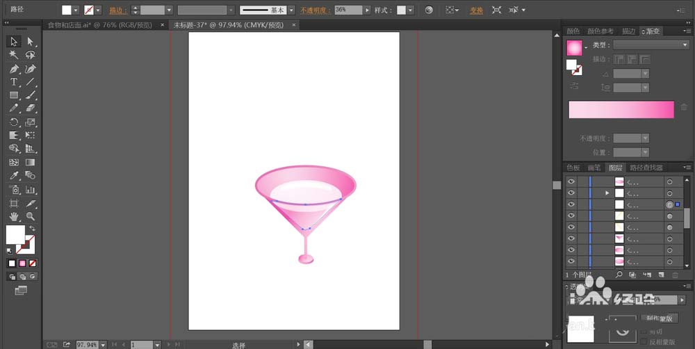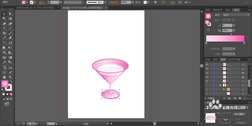2、继续用钢笔画出玻璃杯的下面部分的路径并用粉红色填充,在正面的高光区域用透明度为40%的白色填充。