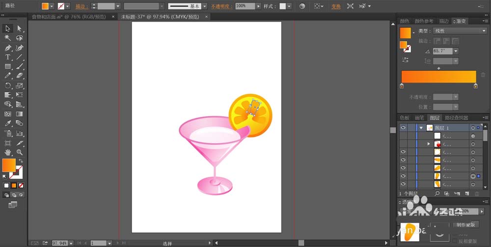 4、接着,我们使用圆形工具与钢笔画出玻璃杯右侧的柠檬片的路径,我们用橙黄色的渐变填充果肉的内部,用橙色色的渐变填充外边缘与内部的暗光结构的路径。