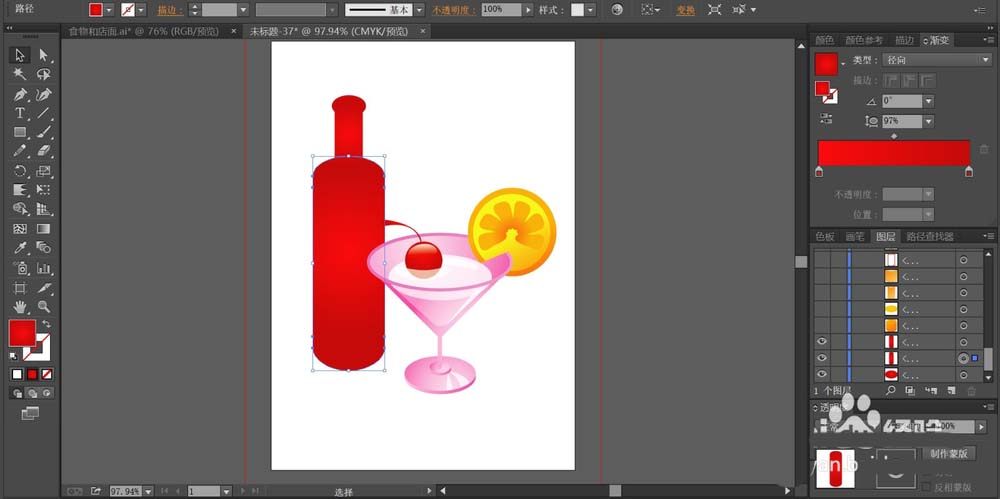 6、最后,我们用矩形工具画出酒瓶的路径并用红色的渐变填充各个结构。