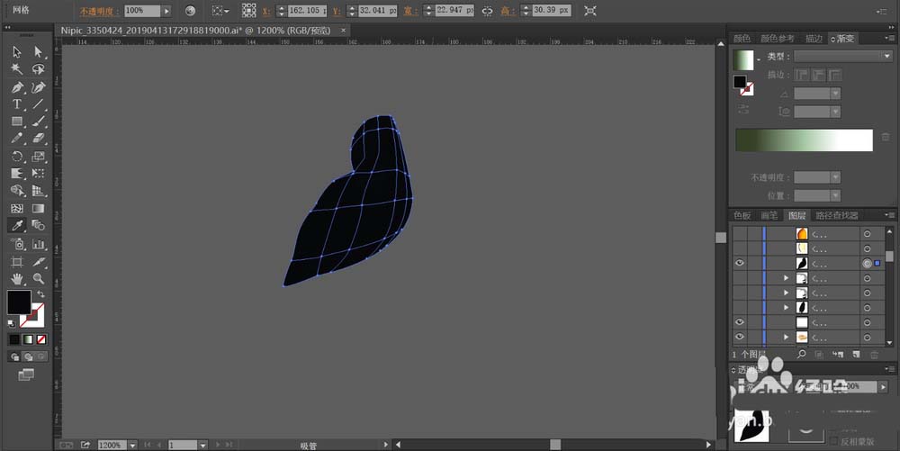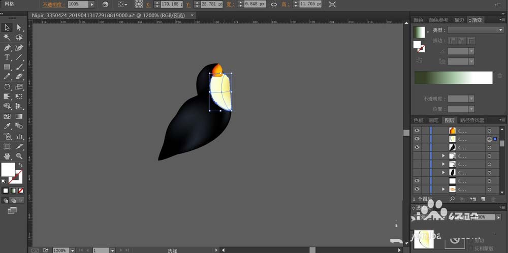 2、先用黑色填充鸟的身体路径,再用网格工具分成不同的色彩路径,我们在背部的下方做出高光的效果。