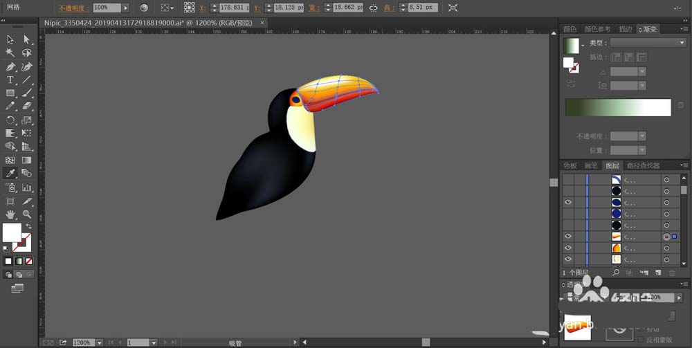 6、最后,我们使用网格工具应用之前的填色方法绘制出大嘴鸟的尾巴,再用灰黑色与灰黑色填充鸟的腿,完成大嘴鸟图片设计。
