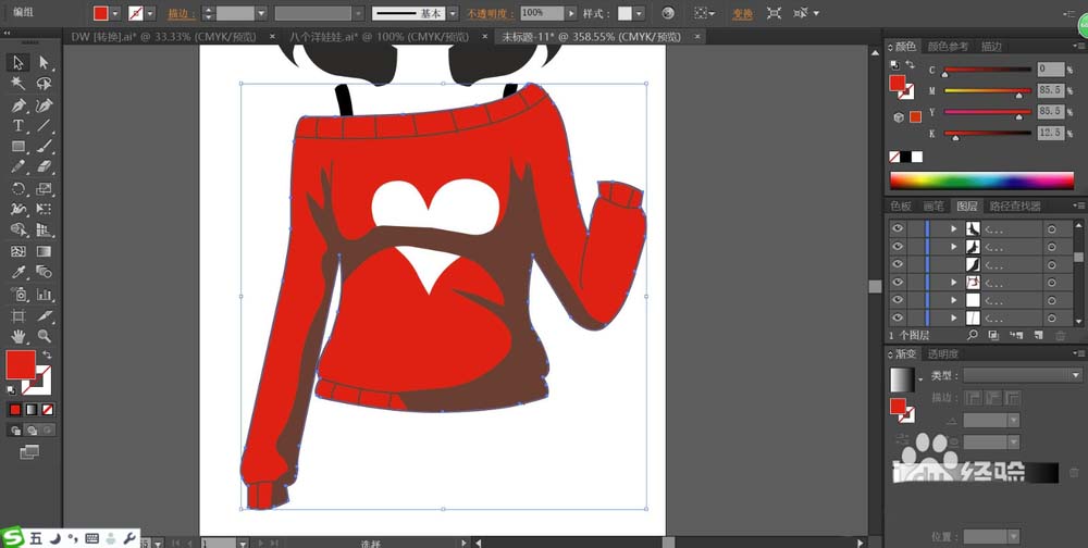 4、我们用暗红色与咖啡色搭配填充这个服饰的主体与暗光区域,服饰上面的心形用白色填充,领口的细节用咖啡色进行描边。