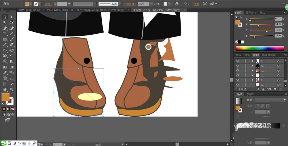 7、最后,我们画出鞋子的路径,再用咖啡色填充主体,用黑色填充暗光区域,用橙黄色填充鞋子的边缘,再画出女生的皮肤部分的路径放在最后,我们用淡粉色填充,完成短发女生形象设计。