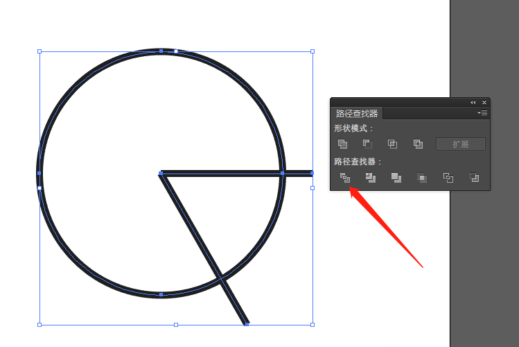 3、选中圆形和两条线,点击上面选项栏的窗口—路径查找器,在路径查找器的窗口中点击分割