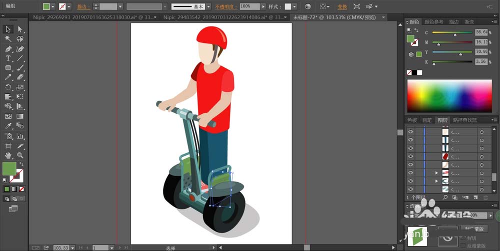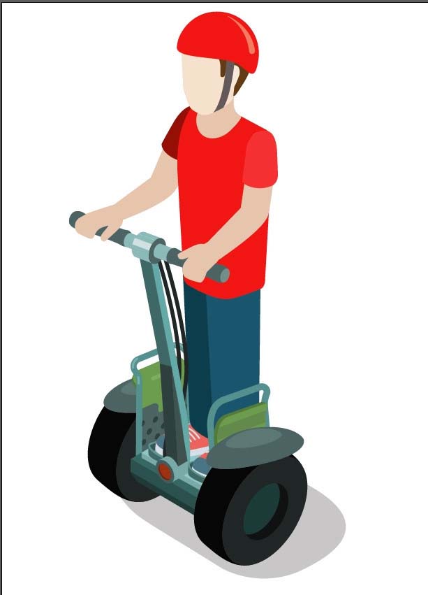 8、最后,我们用绿色与暗绿色填充骑车人脚两边的挡板,金属弯管用青灰色填充,完成平衡车骑士形象设计。