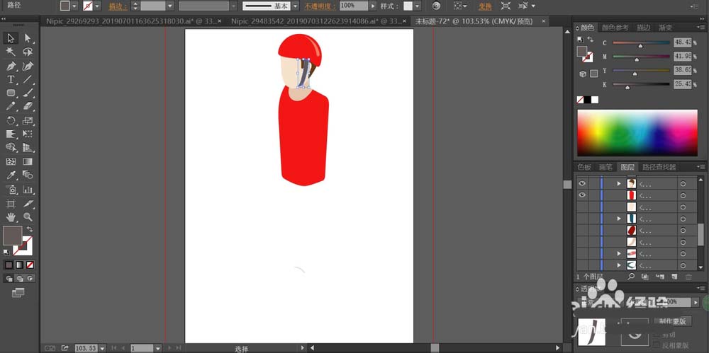 2、用红色填充人物的帽子与服饰,用粉色填充脸,用棕色填充头发,帽子上面的高光区域用半透明的白色填充。