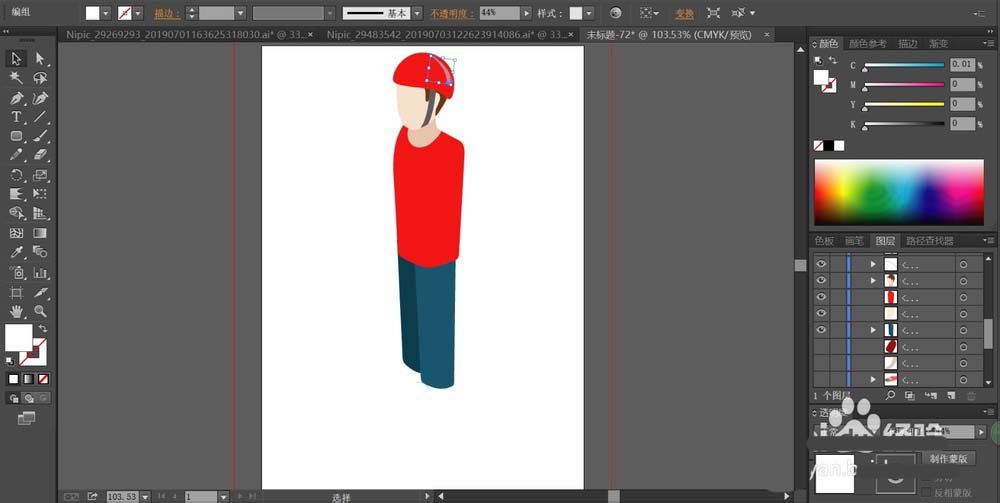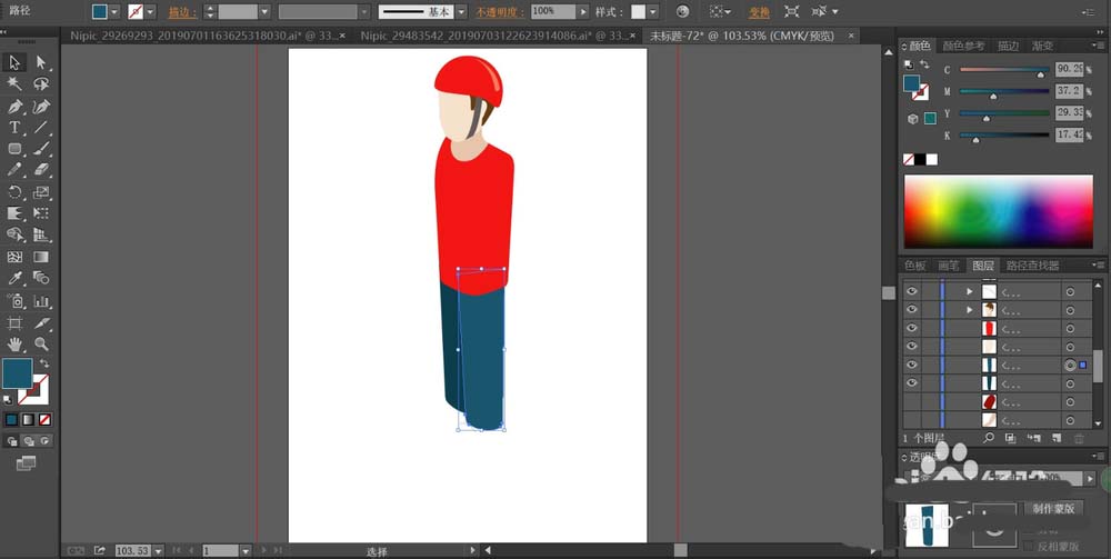 3、用两种不同的藏青色填充人物的长裤路径,再用灰黑色填充帽子的松紧带,用深红色填充服饰的袖口。