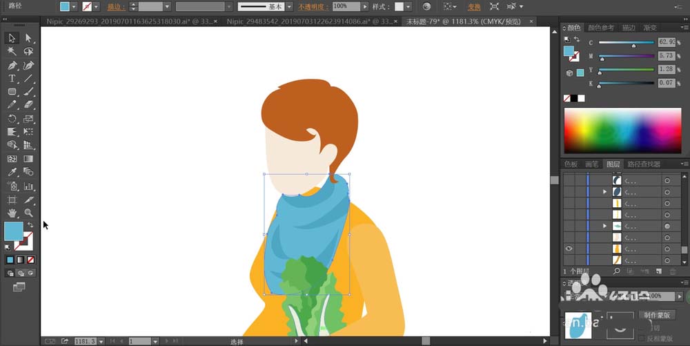 2、用黄褐色与粉色搭配填充女士的头发与脸蛋,再用两种亮度的蓝色填充女士的围巾,接着用两种橙色来填充女士的裙子。