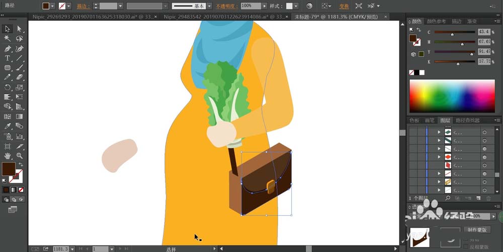 3、继续用三种不同明度的绿色填充女士手里的青花的叶子,再用灰白色填充菜梗,用两种不同的咖啡色的填充女士斜跨的包包的不同侧面,再用橙色与暗橙色填充包包上面的结构件。