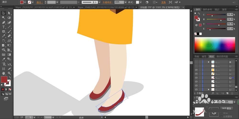 4、女士的腿部用明暗不同的粉色填充,左脚的色调稍暗一些。鞋子用暗红色与灰色搭配填充鞋面与鞋底。女士的影子用灰色填充,设置成正片叠底的模式。