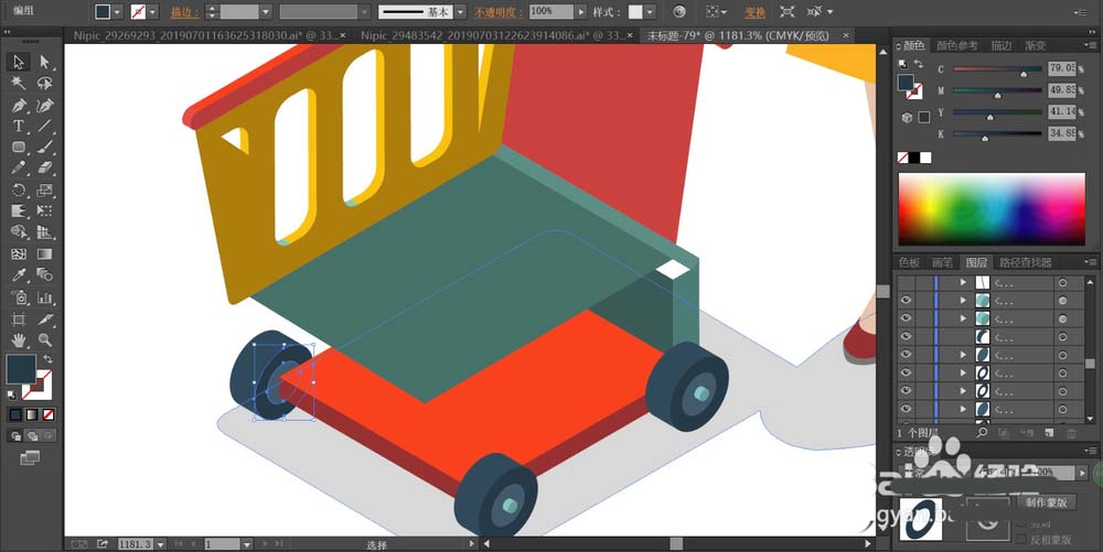 5、这一步,我们开始对于购物车进行填充,用两种不同亮度的红色填充购物车的最底层截面与顶端,再用青色与青黑色分别填充车轮的正面与侧面,车轮中间的小结构件用亮青色与青灰色分别填充。