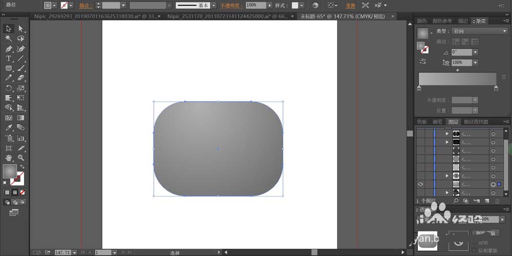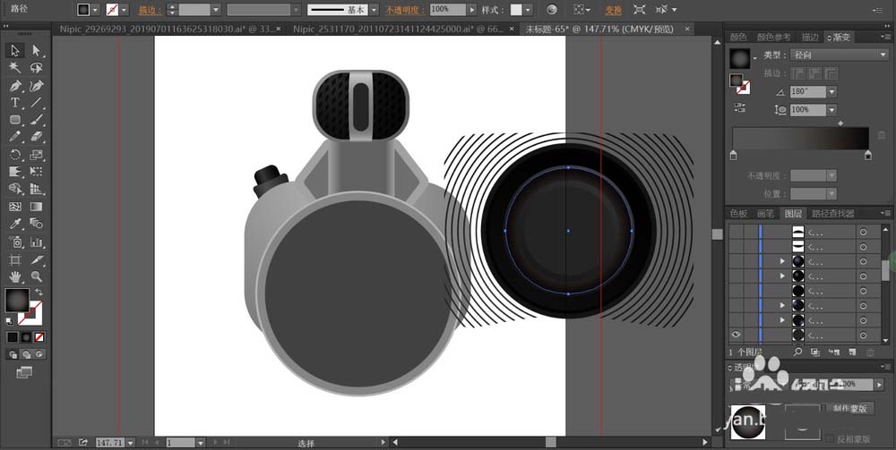 7、最后,我们填充圆形区域用多层次不同的灰黑色渐变与灰色的渐变重叠在一起,从而让光线的变化层次更加的丰富,让这些变体呈现在镜头的圆形区域,完成相机图片设计。