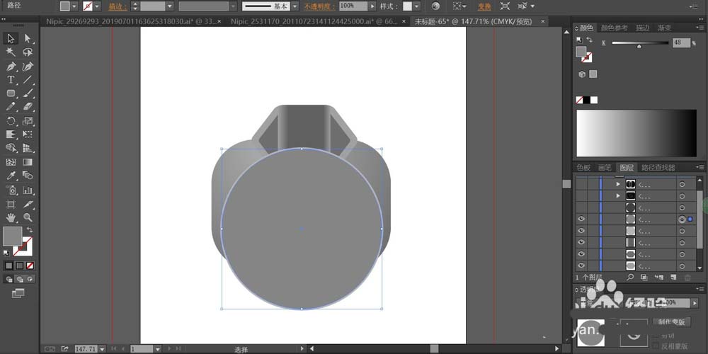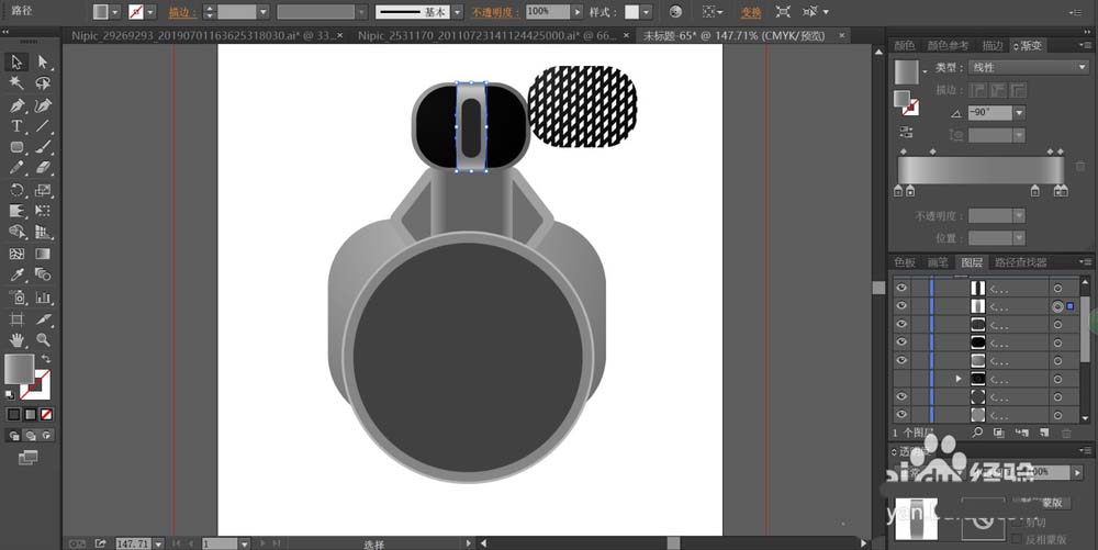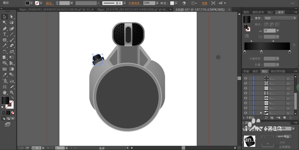 4、这一步,我们用灰黑色的渐变填充灯头前方的网格结构路径,再移动到灯头上方,在灯头的下方用灰黑色填充相机的快门结构,让快门结构件呈现在相机的中间左上方位置。