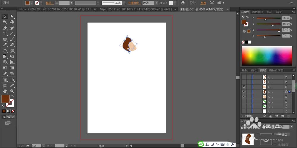 2、用深棕色填充男子的头发,再用粉色填充他的脸蛋。在头发的高光区域用红棕色填充高光元素路径。
