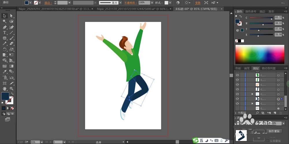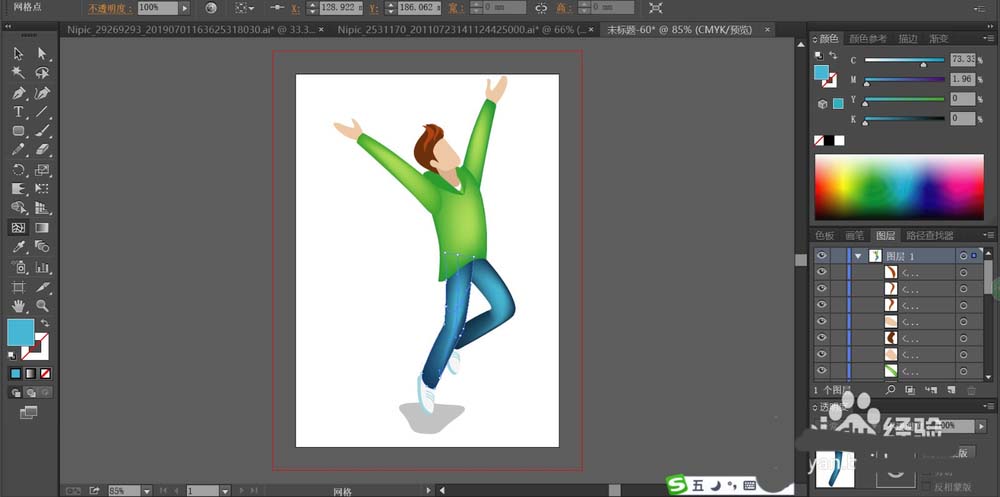 6、最后,我们再用网格工具给男人的长裤做出蓝黑色的渐变效果,完成跳跃男子素材设计。