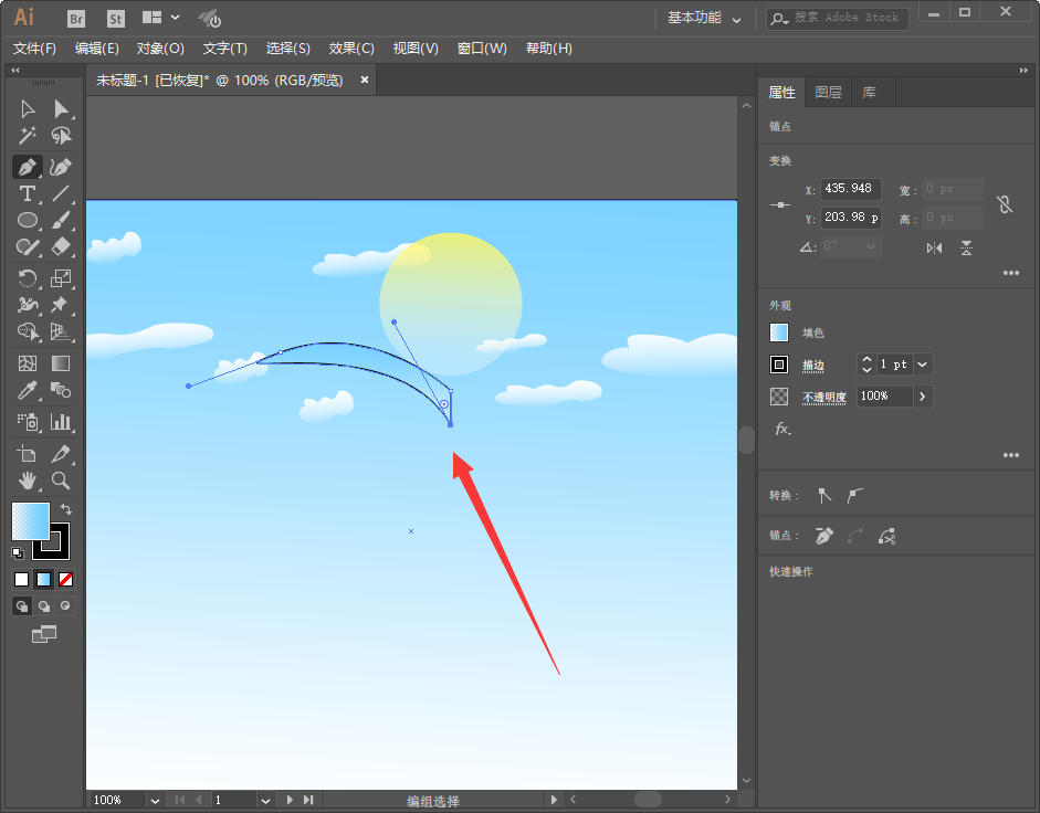 1、我们打开之前天空和太阳的画板,然后选择钢笔工具,快捷键是P,如下图所示;