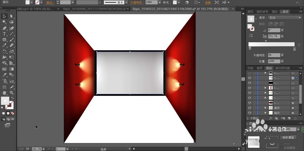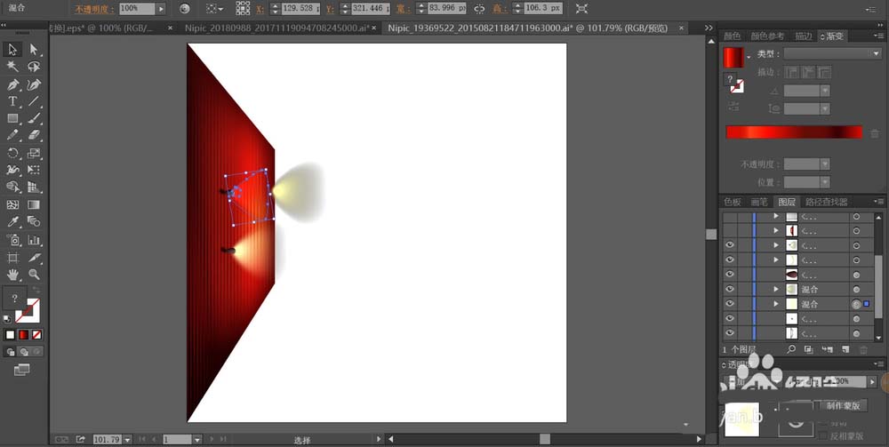 4、先用灰黑色的渐变填充灯具,再用半透明的红色渐变填充光圈,设置成叠加模式放在最下方,再用混合工具做出一个大的半透明的光圈放在上方,从而形成射灯的光圈效果,左侧墙壁绘制出两个射灯。