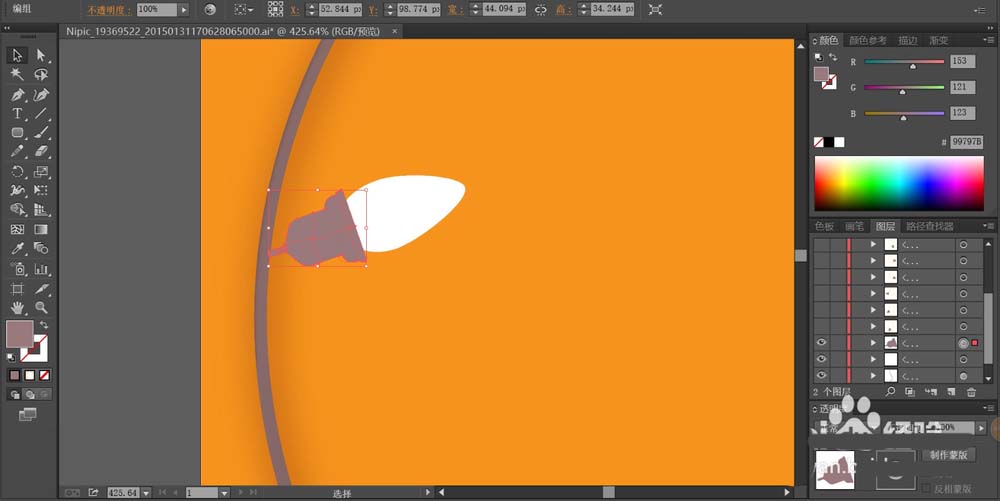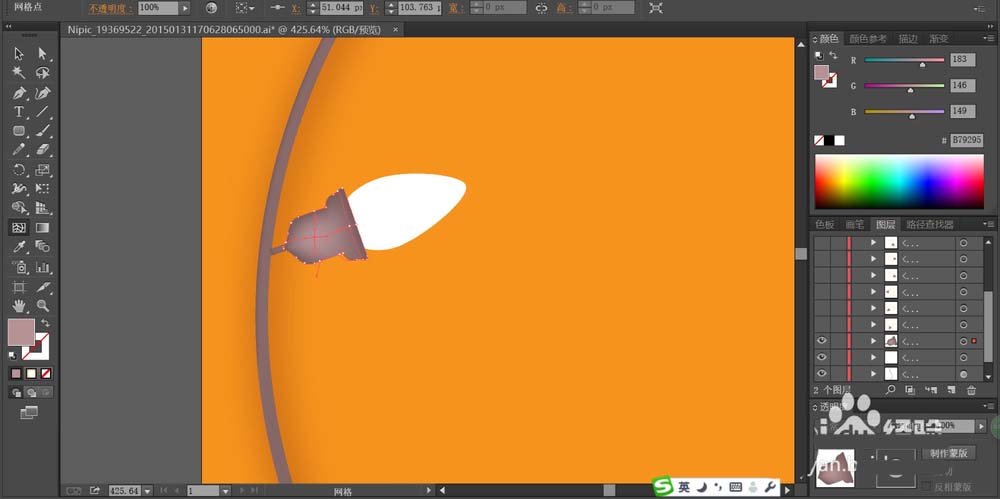 3、用紫灰色填充灯泡的底座,再用白色填充灯泡的玻璃,使用网格工具给底座绘制出紫灰色的渐变。