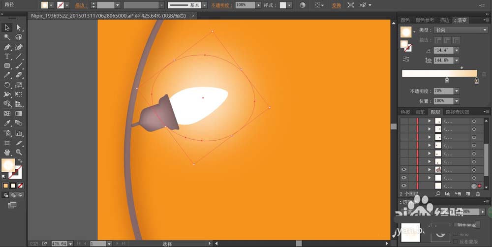 4、接着,我们用圆形工具画出灯泡的虚影,再用白色到黄色的渐变填充虚影,设置渐变末端的色彩透明度为60%。