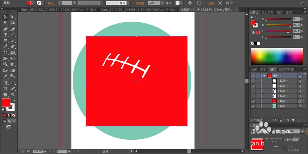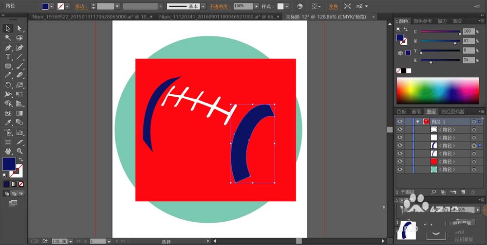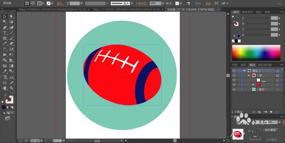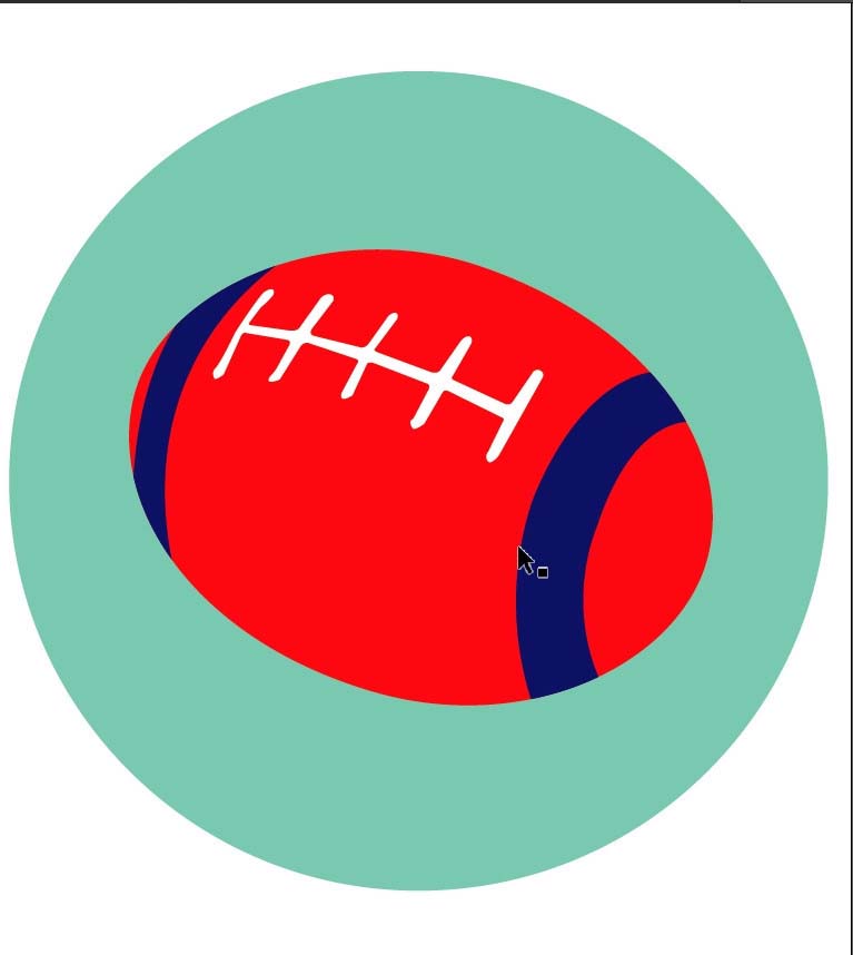 3、用青灰色填充背景圆形,再用红白色搭配填充橄榄球与线条图案。