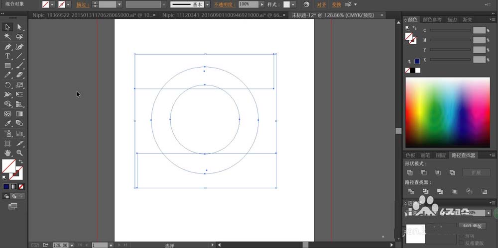 1、我们先来画出球体中间的圆弧,使用圆形工具制作出一个圆环,再用矩形工具去剪裁,从而得到两个圆弧环。