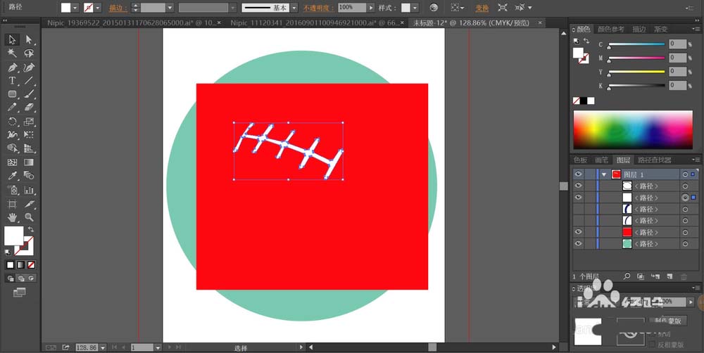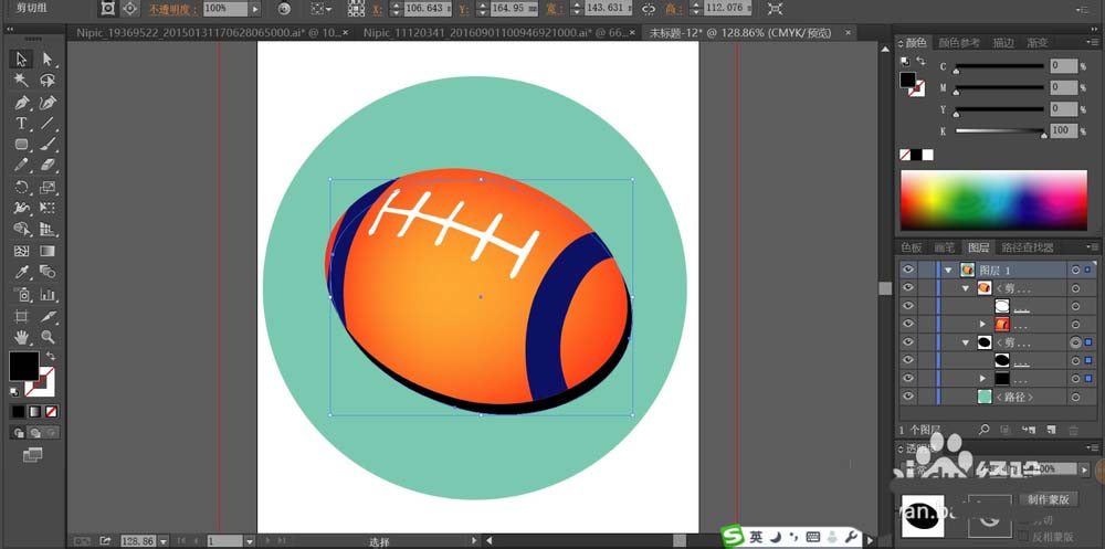 5、选择不同的色块,整个球体用椭圆形状再做一下剪裁,从而让画面中出现一个完整的球体形状。