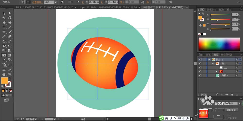 6、最后,我们再来制作一个不同的色彩搭配方案,使用网格工具点击一下椭圆形状的球体,我们制作一个橙色的渐变效果,就有了橙色的橄榄球。