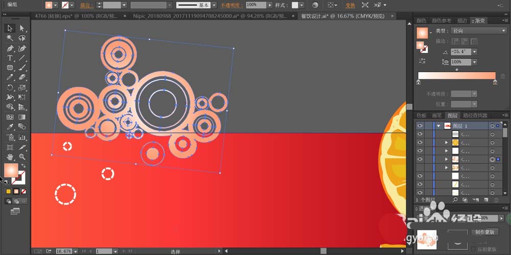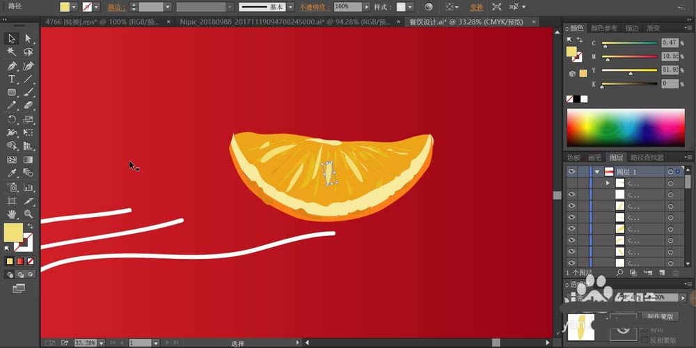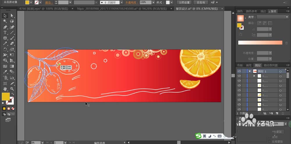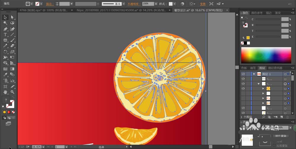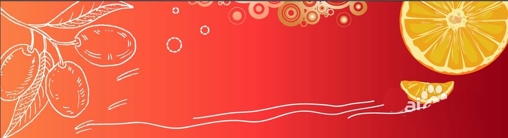 7、最后,我们用矩形给超出招贴画范围的圆形元素与桔子做一个剪切,从而让完整的招贴画背景呈现在画面之上,再加上自己所需要的文字放在中间,用白色或者黄色填充,就可以完成水果招贴画的设计。