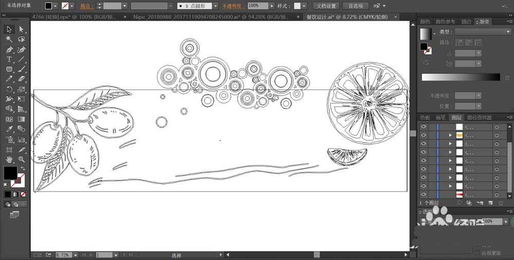 1、先用钢笔画出招贴画的基本轮廓,再把重点的元素桔片、桔瓣、圆形、水果叶片的剪影一一呈现在招贴画所在的矩形的不同位置。