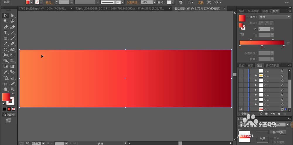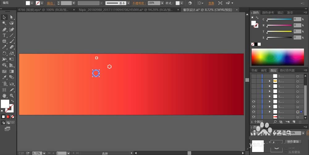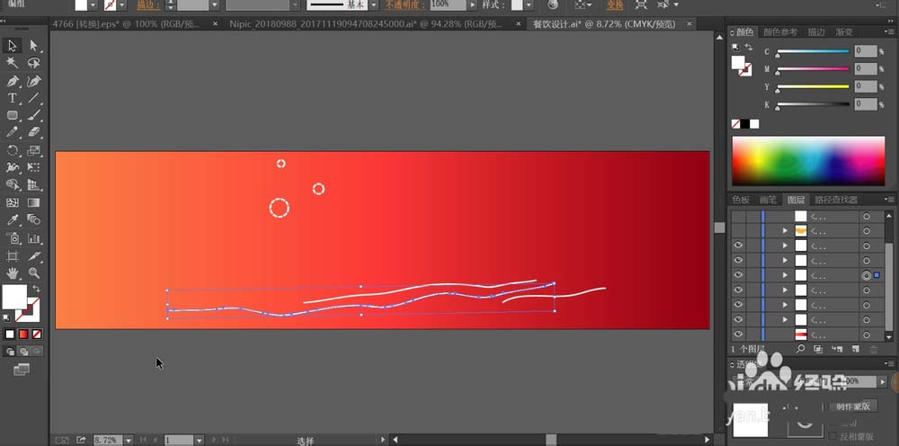 2、用红色的渐变填充招贴画所在的矩形,用白色对于招贴画上面的圆圈进行描边,用白色对于招贴画上面的线条进行描边。