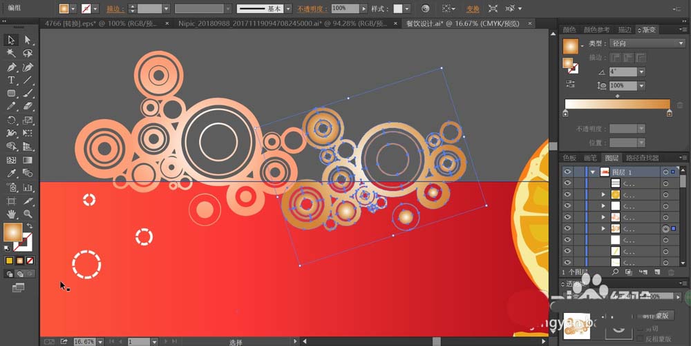6、这一步,我们分别用桔红色与桔黄色填充招贴画中间上部的圆形元素的轮廓,让其对称出现在招贴画的内部与外面。