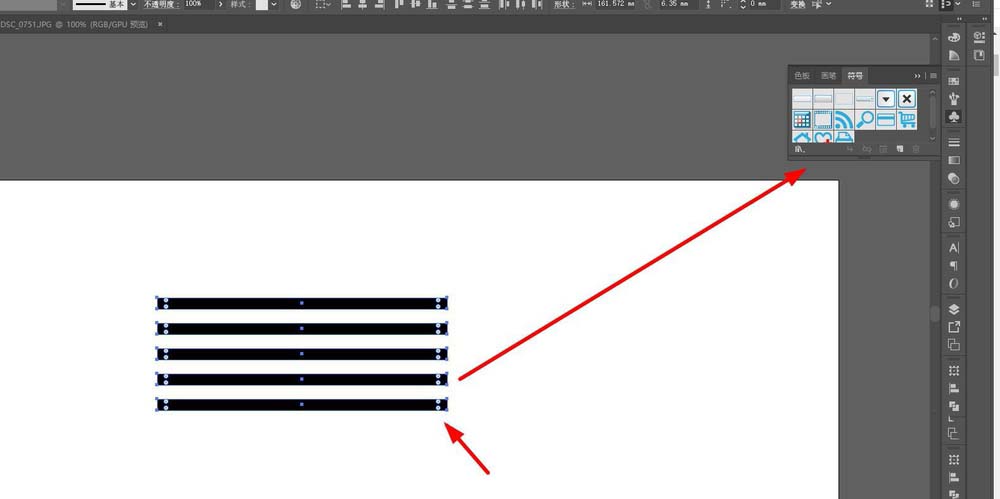 2、打开符号面板,我这里一直都在右侧,那么,符号面板的位置在:窗口>符号,打开就行。快捷键:shift+ctrl+F11。打开符号面板后,全选条形图,拖进去, 之后会出现一个对话框,更改一下名称。这一步就算完事了。
