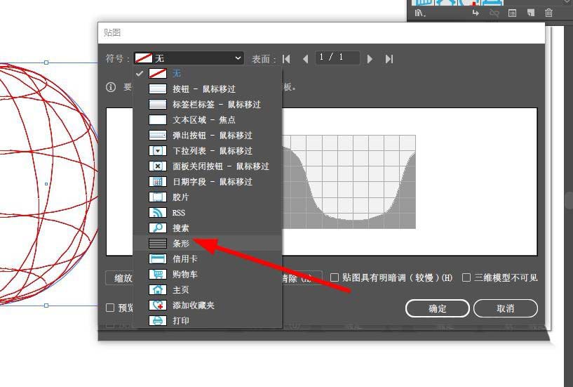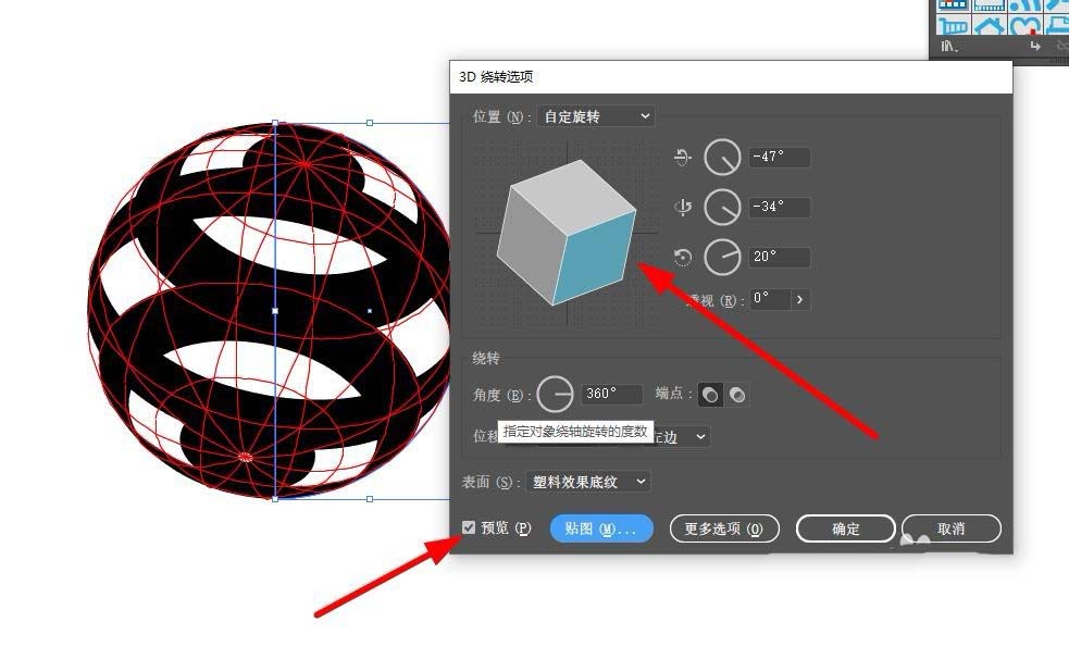 4、接着就是,效果>3D>绕转。打开对话框面板后,选择贴图。然后选择你刚才制作的条形。调整适当位置,在右下角的“三维模型不可见”前打上勾。