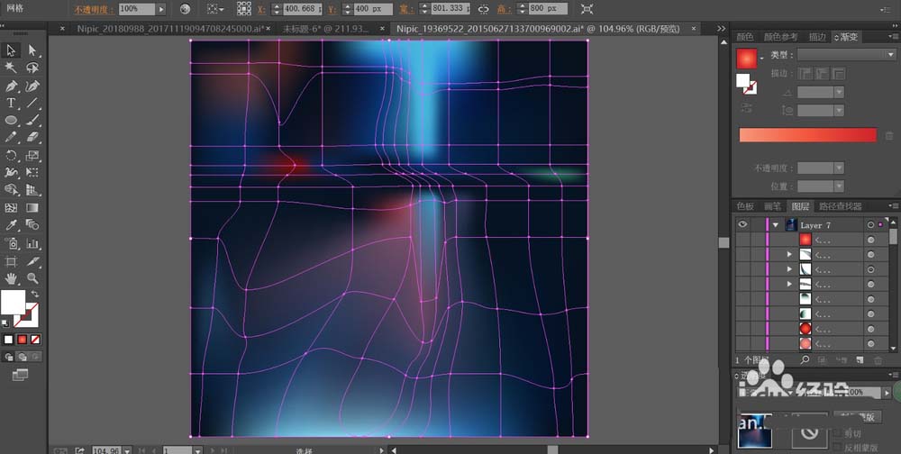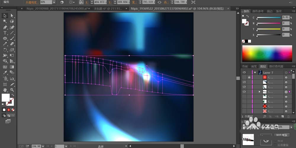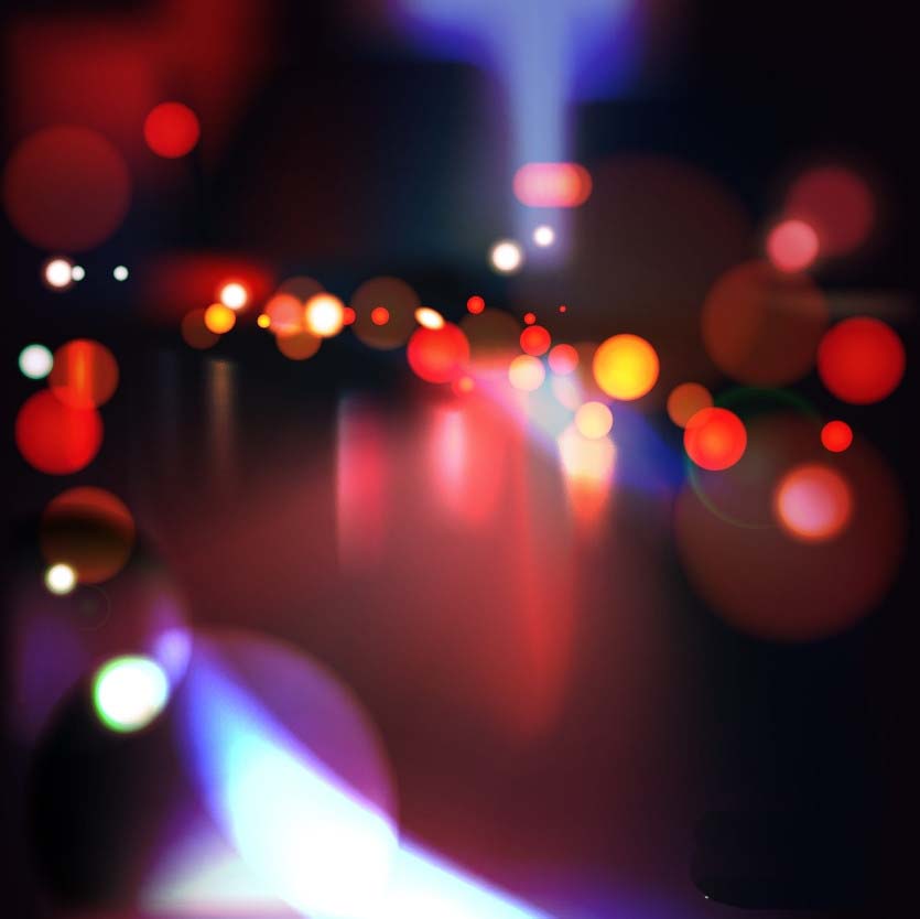 1、先用钢笔画出夜景所在的背景,再用网格工具处理成不同的区域,我们用黑色填充整个背景,再用蓝光在中间区域进行高光的绘制,在左右两侧用红光进行暗光的处理。
