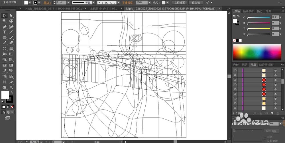 4、在画面的中间位置绘制出红色的光圈,设置模式为变亮,让大小不同的红色的光圈出现在画面中间弧线的各处位置,让光圈从小到大放射形态出现。