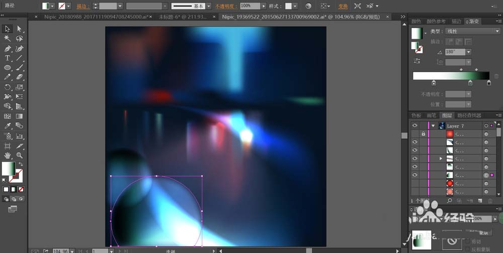 3、接着,使用圆形工具画出光圈在左下方位置,我们设置成白色、青色、黑色的渐变效果,白色更多一些,从而让下方出现一个大的光圈,色彩模式为叠加。用同样的方法在整个背景当中复制多个大小不同的光圈效果。