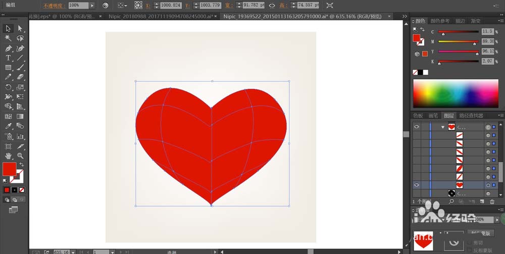 2、使用红色填充心形,再用网格工具画出高光与暗光的网格,我们在高光区域做出红色到黄色的渐变效果,在暗光区域做出暗红色的渐变效果。