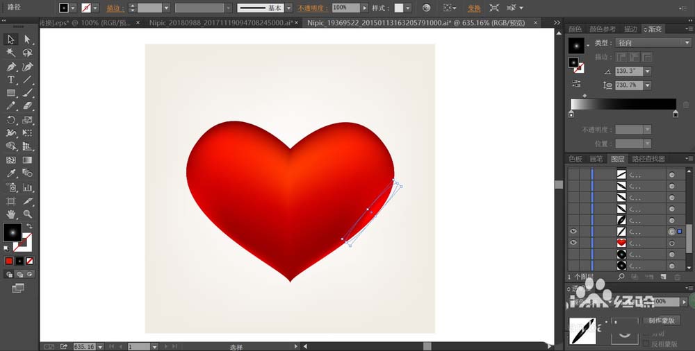 3、接着,我们用黑白色的渐变填充心形右侧的高光区域,设置成颜色减淡的模式。再用同样的方法在红色心形的边缘位置设置多个高光区域。
