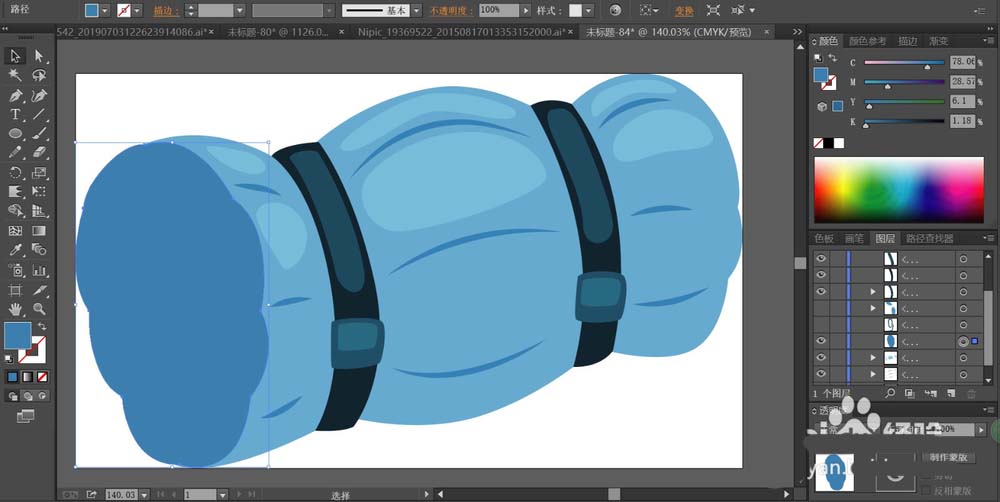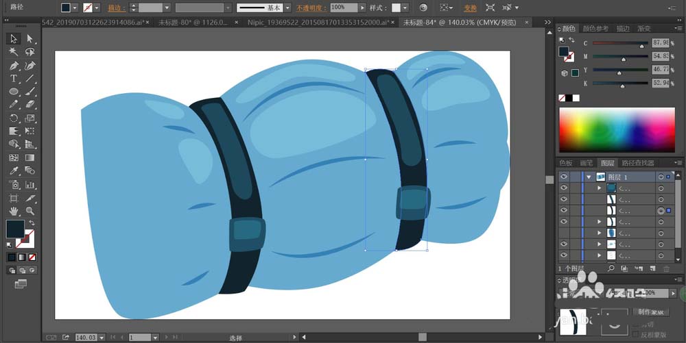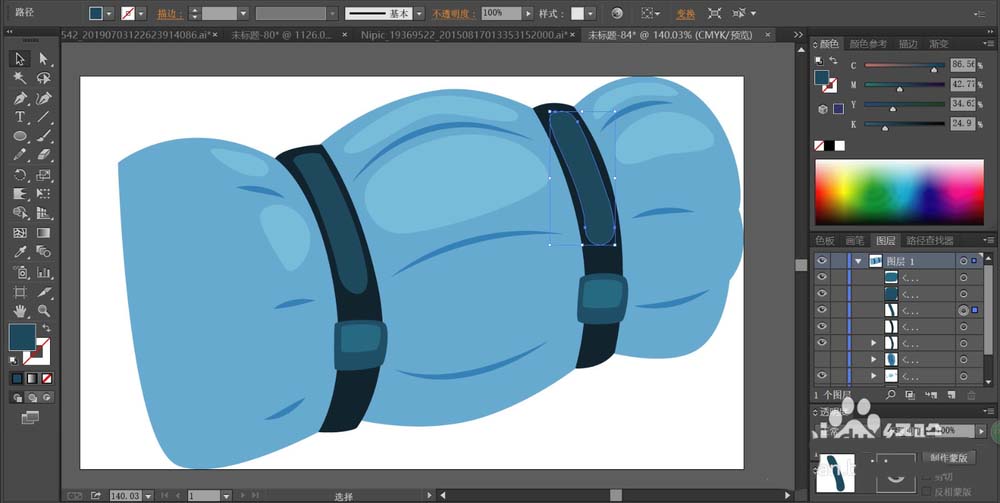 4、这一步,我们用蓝黑色填充床垫正面的捆绑带的路径,再用蓝灰色分别填充填充带子上面的高光区域,调整一下蓝灰色的明度再填充一下中间色调的区域。