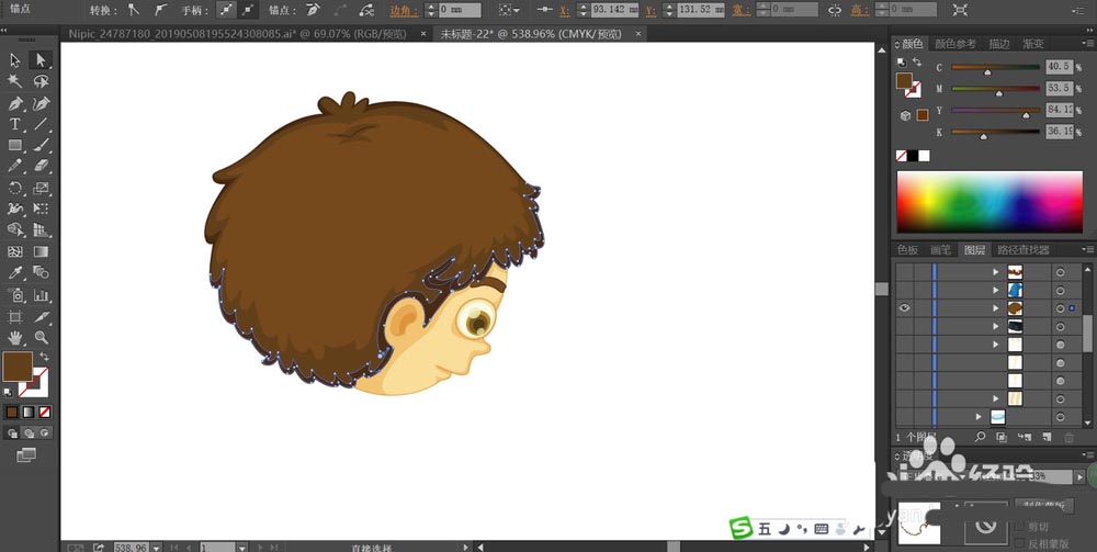 2、接着,继续使用两种棕色搭配填充男孩的眼晴,眉毛也用棕色进行填充,在耳朵的暗光区域用淡棕色填充。