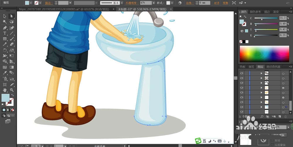 8、最后,我们画出洗手池的轮廓,使用天蓝色与淡蓝色搭配填充洗手池的主体与高光区域,在右侧边缘设置暗光色彩为正片叠底,在高光区域设置淡蓝色为半透明的状态。地面的阴影用灰白色填充,完成洗手男孩素材设计。