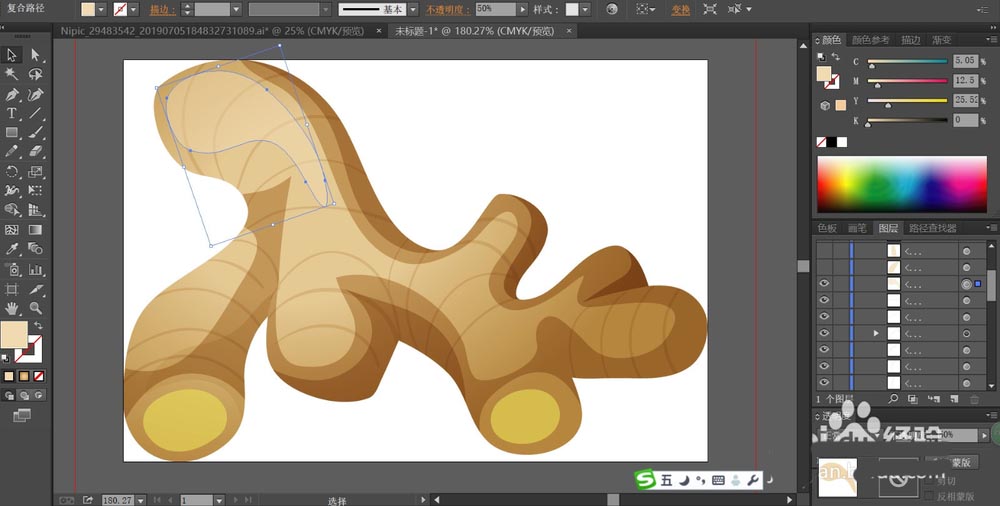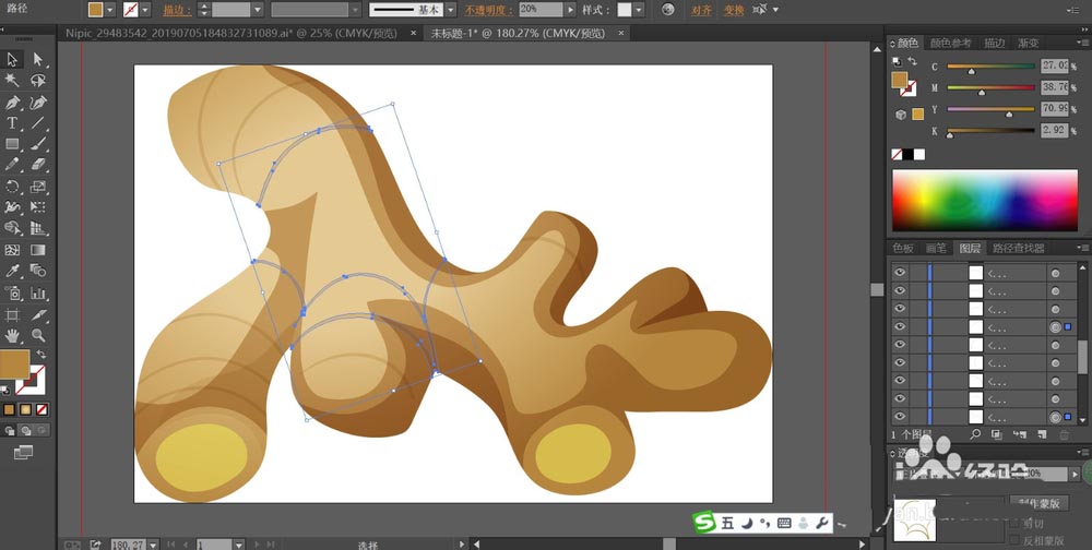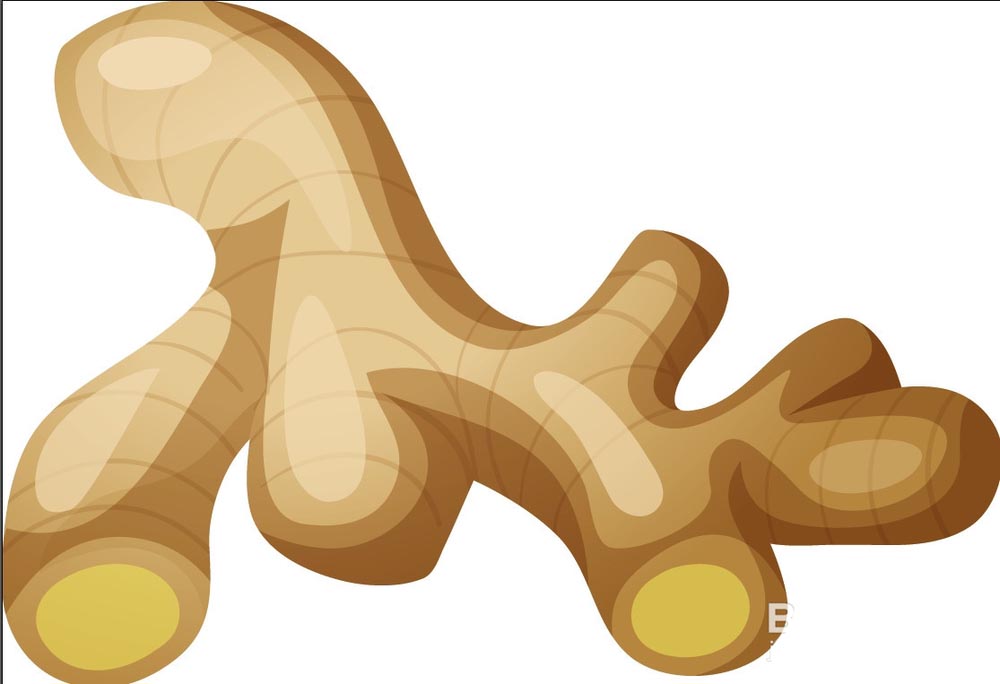 7、在生姜的周围画出更多的高光路径并填充半透明的白色,在生姜的右下侧继续画出暗光并填充生褐色,设置正片叠底模式来加强这一区域的暗光效果,完成生姜图片设计。
