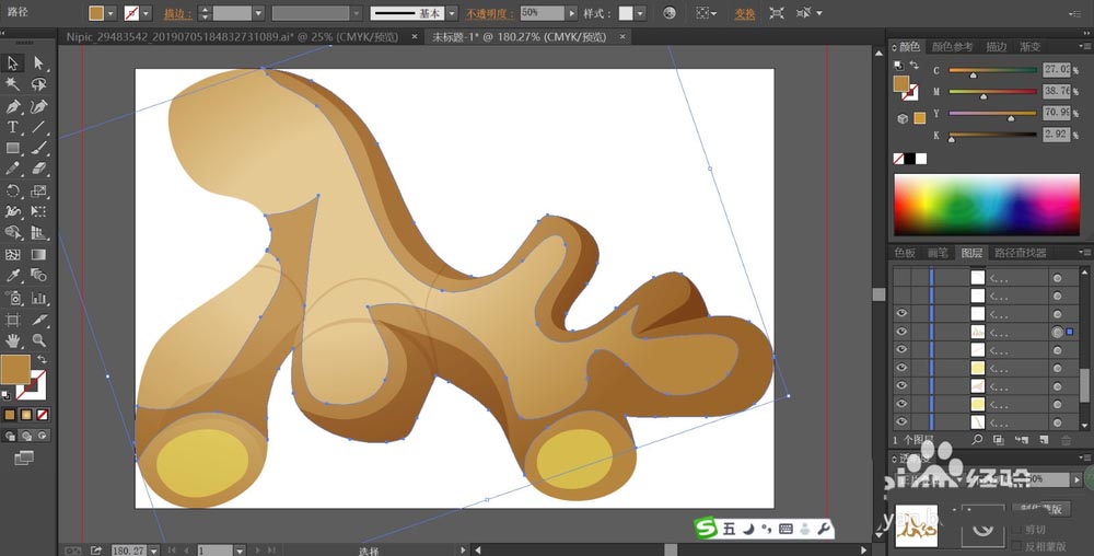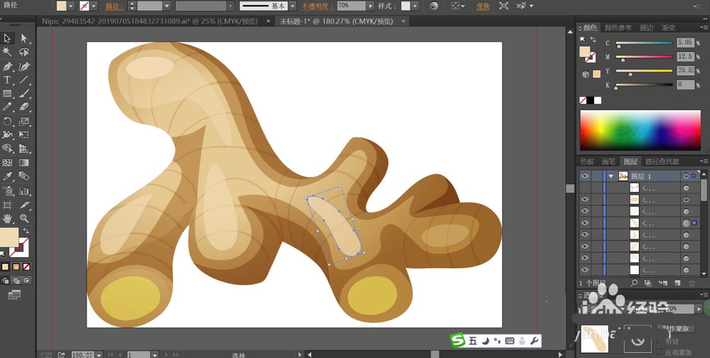 2、设置土灰色的渐变填充整个生姜的路径,让左侧上方为高光,右侧为暗光。在生姜的右侧边缘描绘出不同的暗光路径。